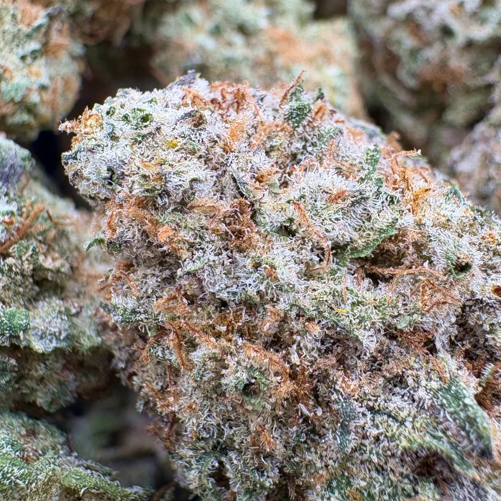 Mac Donuts features dense, frosty buds with a generous coating of trichomes, giving it a sugary appearance. Expect deep greens and purples beneath a layer of sparkling crystals, with fiery orange pistils woven throughout. Sticky and pungent, this strain has serious bag appeal.