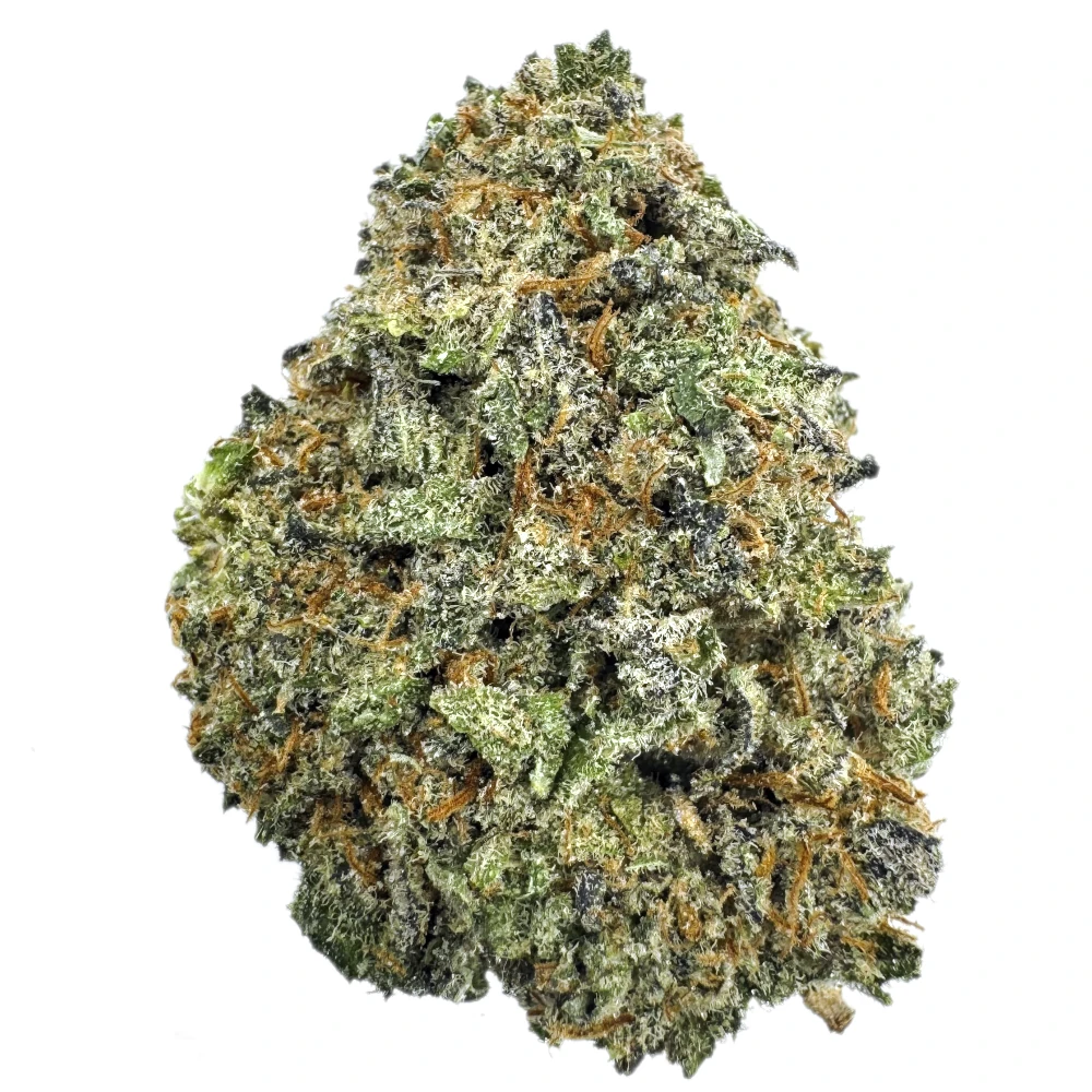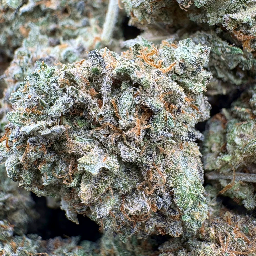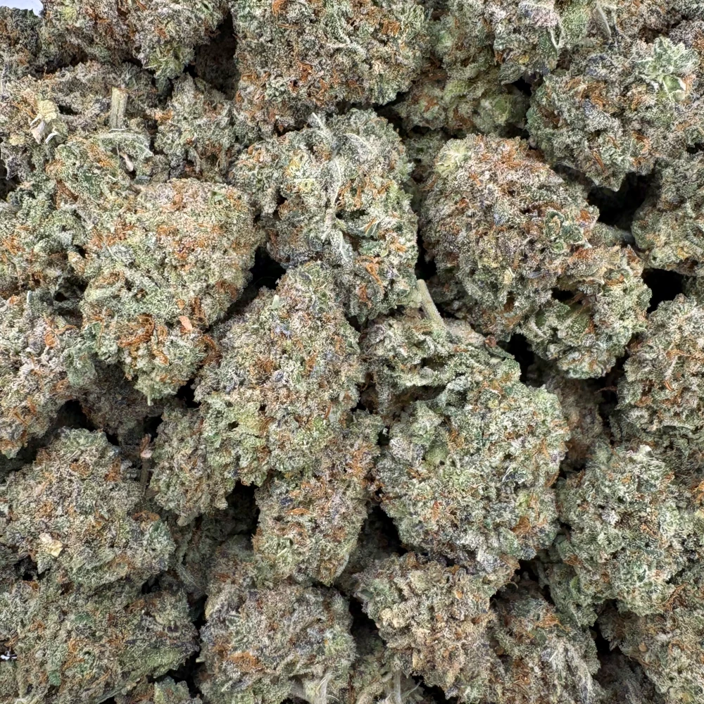 These dense, chunky buds showcase deep forest green hues with hints of purple, wrapped in fiery orange hairs and coated in a thick layer of frosty trichomes—clear signs of its high potency.