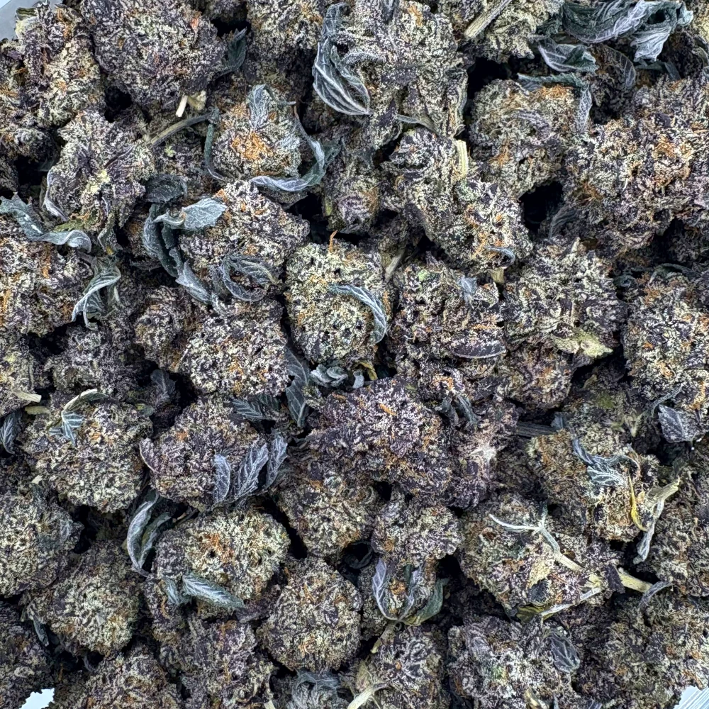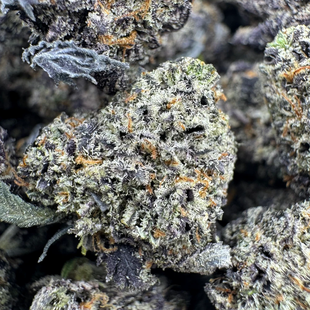 Small but mighty, these “popcorn” buds are dense and vibrant, showcasing shades of purple and green with fiery orange pistils. A sparkling layer of frosty trichomes hints at the strain’s potency.