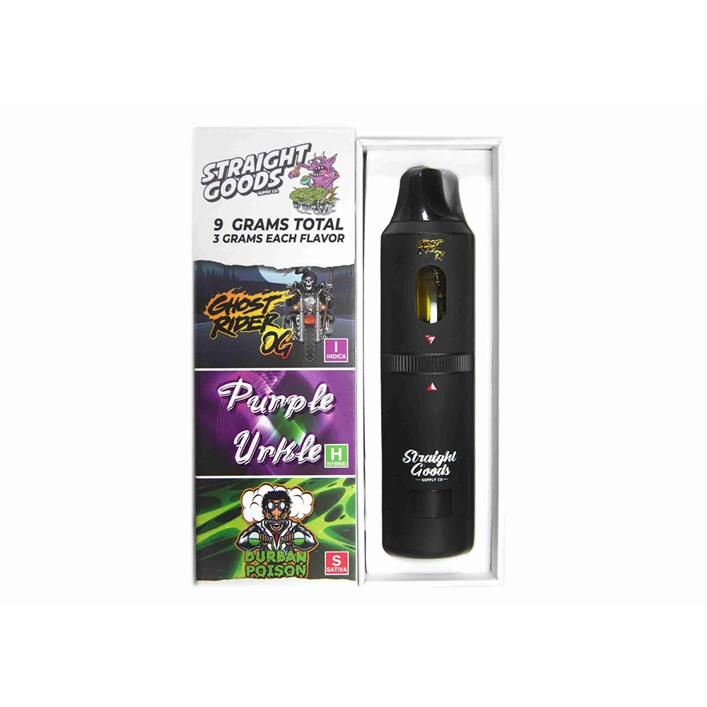 Discover a new level of convenience and potency with Straight Goods Supply Co.’s Triple Chamber Disposable Vape. This advanced 9g device (3g + 3g + 3g) packs three unique flavours into one streamlined pen and comes in Indica, Sativa, and Hybrid options, making it easy to choose the experience or effect you want.